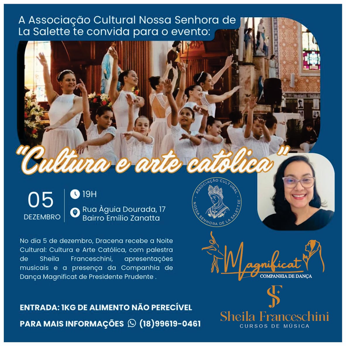 Companhia de Dança Magnificat de Presidente Prudente tem apresentação em Dracena com palestra também de Sheila Franceschini Por Valdomiro Nunes - dezembro 5, 2025 36 A Companhia de Dança Magificat de Presidente Prudente tem apresentação marcada para hoje em Dracena no evento Cultura e arte católica, que terá também palestra de Sheila Franceschini.