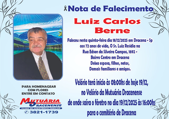 Faleceu Luiz Carlos Berne residente em Dracena