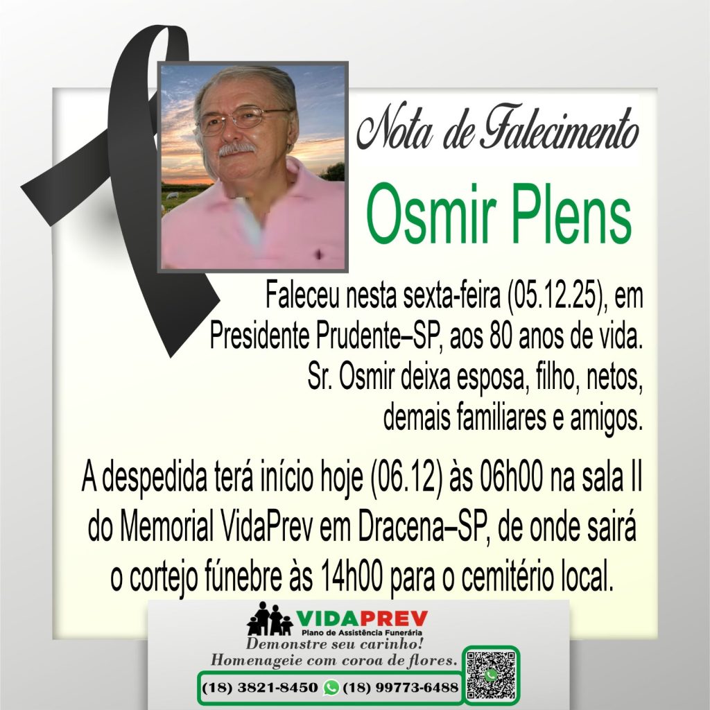 Nesta sexta-feira, faleceu o engenheiro Osmir Plens, que estava internado há 90 dias em Presidente Prudente. Deixa a esposa Gásua, filho Marcelo, nora Aline e netos.