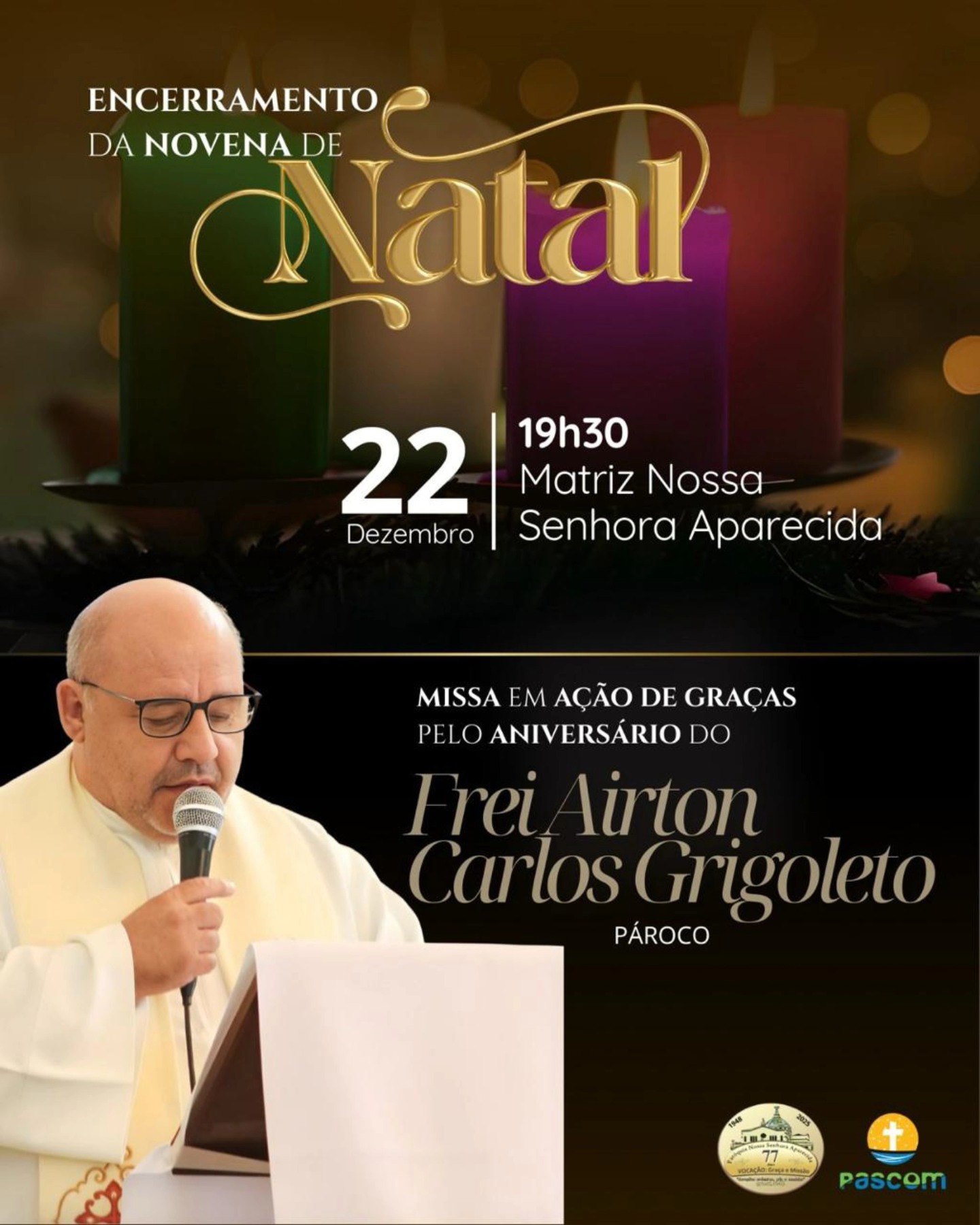 Frei Airton Grigoleto está de aniversário hoje. Será celebrada missa em Ação de Graças Por Valdomiro Nunes - dezembro 22, 2025 107 Católicos dracenenses felicitam o frei Airton Grigoleto. Ele estreia idade nova, com Missa em Ação de Graças que será celebrada hoje, 22 , na Matriz de Nossa Senhora Aparecida em Dracena. Parabéns@