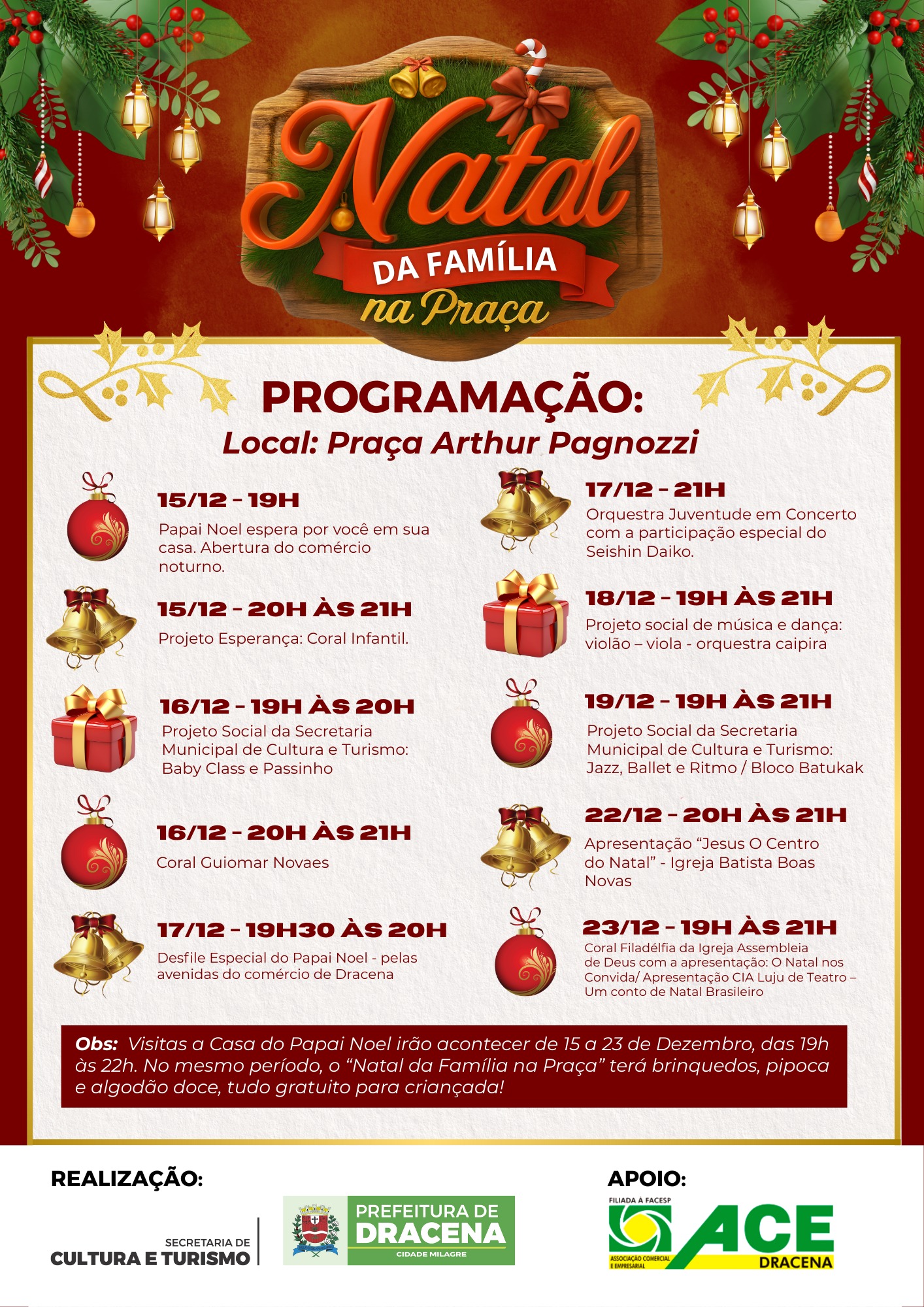 A Prefeitura de Dracena, por meio da Secretaria de Cultura e Turismo e em parceria com a Associação Comercial e Empresarial de Dracena (ACE), preparou uma grande programação para celebrar o Natal, que promete encantar toda a população com atividades culturais, artísticas e momentos especiais de confraternização.