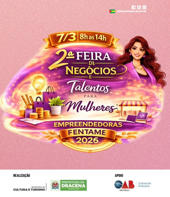 Dia 7 de março 2ªFeira de Negócios em Dracena: Talento para mulheres empreendedoras. Veja detalhes Por Valdomiro Nunes - fevereiro 20, 2026 17
