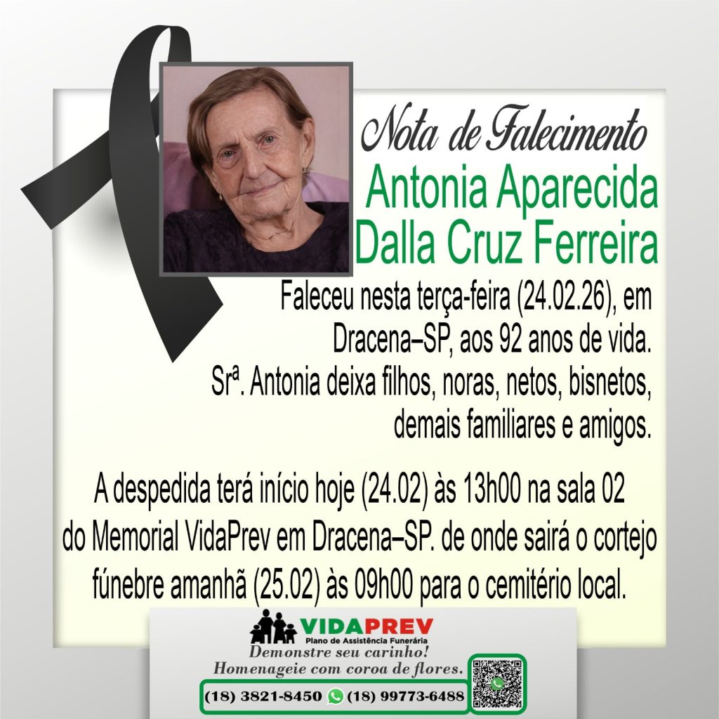 Faleceu a senhora, Antônia Aparecida Dalla Cruz Ferreira