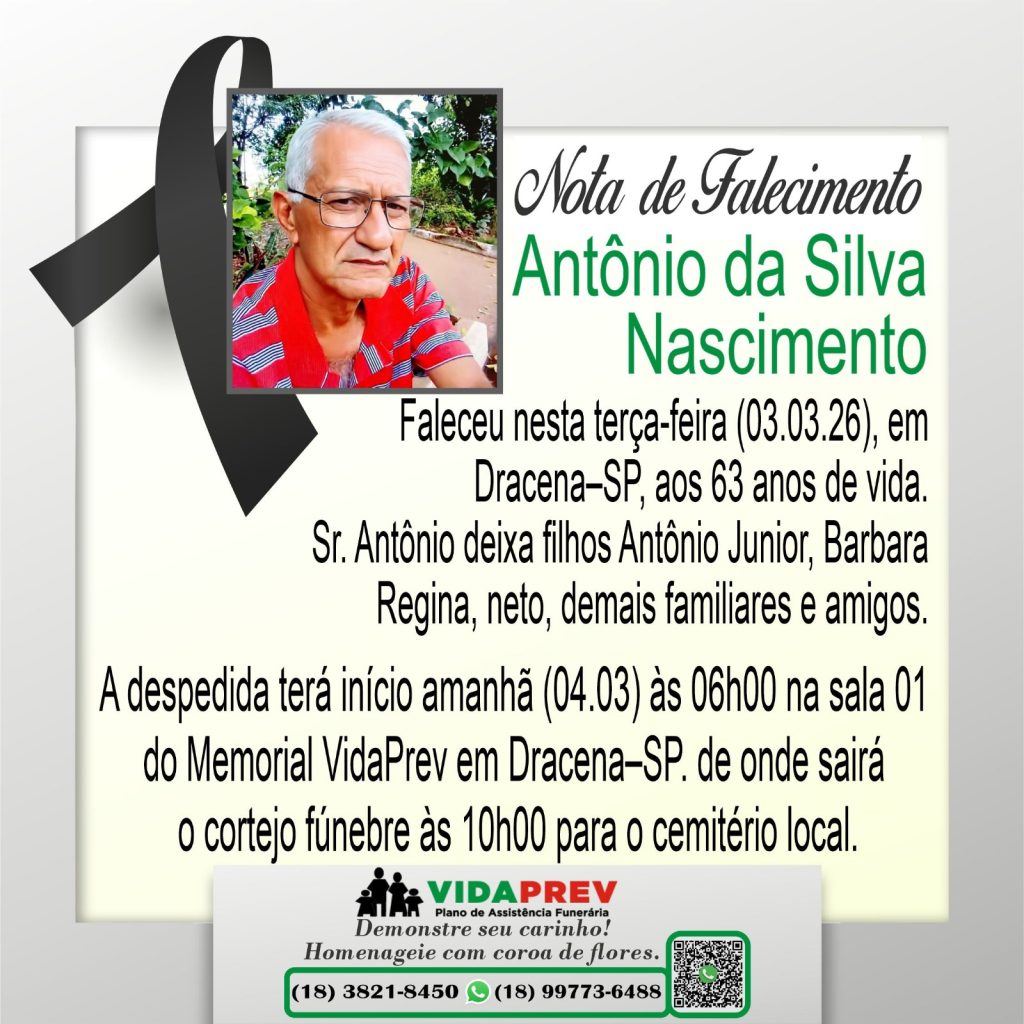 Faleceram em Dracena, Antônio da Silva Nascimento e Adeuíde de Souza Lima Lopes Por Valdomiro Nunes - março 4, 2026 32