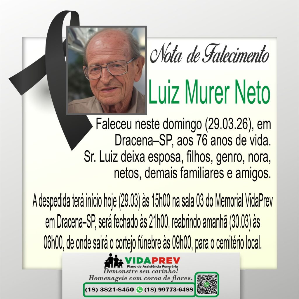 Morre aos 76 anos, Luiz Muerer Neto, valor do setor contábeil em Dracena. Veja horário de velório e sepultamento Por Valdomiro Nunes - março 29, 2026 20