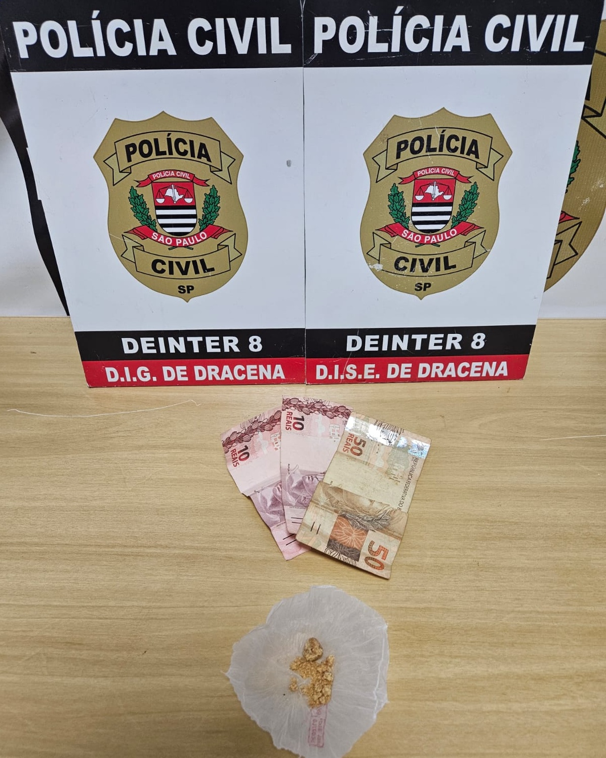 Durante as diligências, os policiais civis também realizaram vistoria no interior do comércio, uma conveniência aberta ao público que comercializa bebidas, cigarros e outros produtos. Debaixo de um armário foi localizado um invólucro plástico contendo uma quantidade significativa de substância com características semelhantes ao “crack”, fragmentada em diversas pequenas pedras prontas para comercialização, além de uma porção maior da mesma substância.