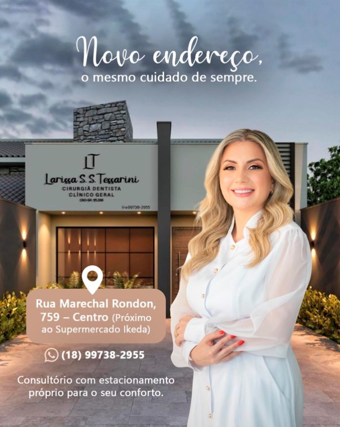 Rua Marechal Rondon, 759, o novo endereço da dra Larissa Tessarini Por Valdomiro Nunes - março 31, 2026 16 Notícia boa: a dentista dra Larissa Tessarini está em novo endereço. Alí na rua Marechal Rondon, 759, em Dracena.