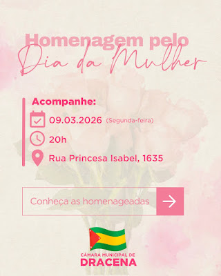 Veja fotos e nomes das mulheres que serão homenageadas pela Câmara Municipal de Dracrena Por Valdomiro Nunes - março 7, 2026 16 Veja fotos e nomes das mulheres que serão homenageadas pela Câmara Municipal de Dracena https://www.facebook.com/camaradracena