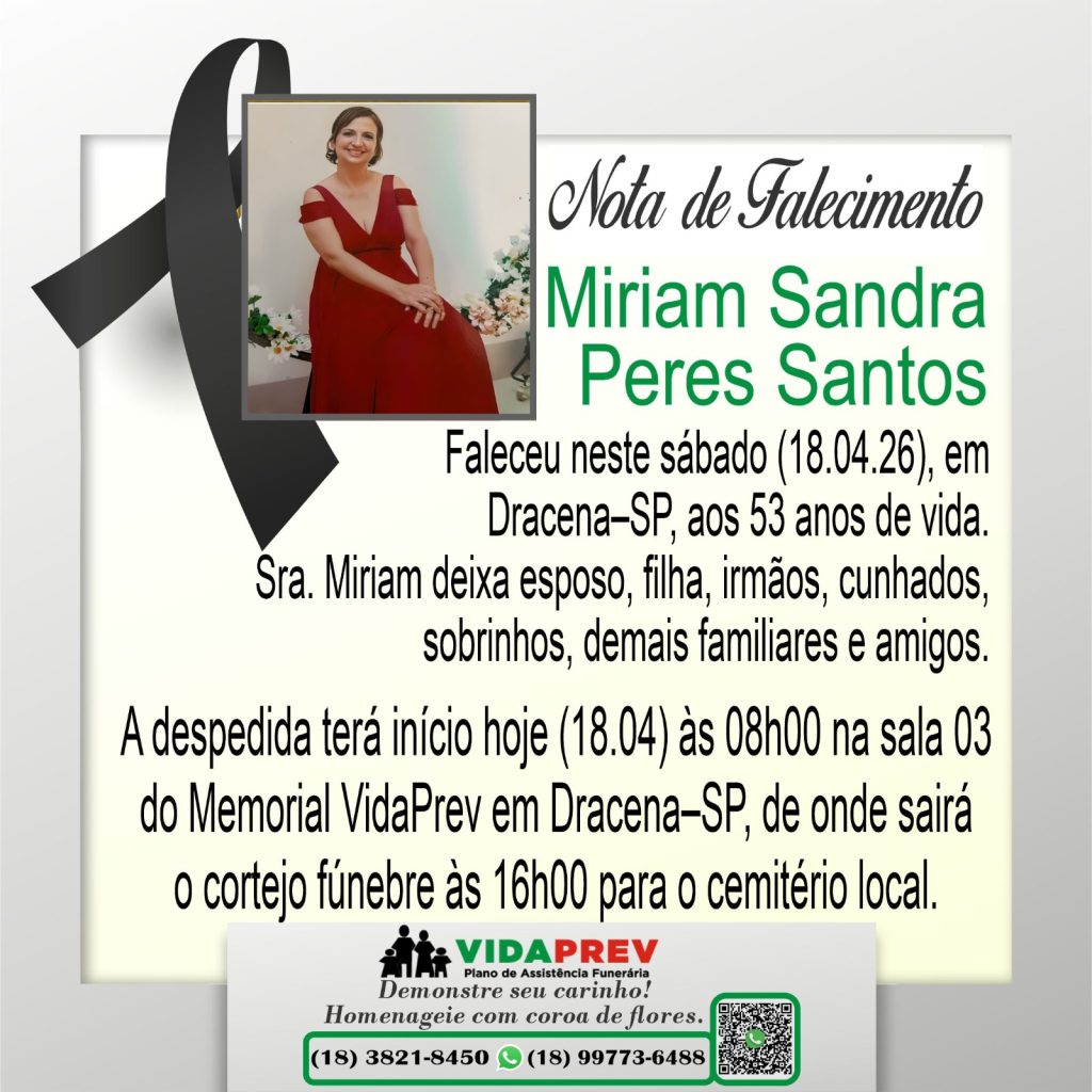 Faleceu aos 53 anos, Miriam Sandra Peres Santos proprietária da Loja Belíssima Moda Intima Por Valdomiro Nunes - abril 18, 2026 53 A ela nossas orações e aos familiares nossa solidariedade.