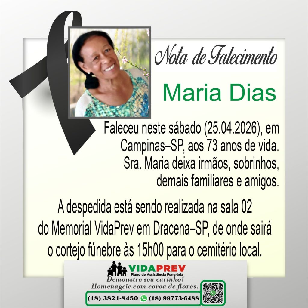 Faleceu Maria Dias que atuou por anos na Santa Casa de Dracena Por Valdomiro Nunes - abril 26, 2026 7