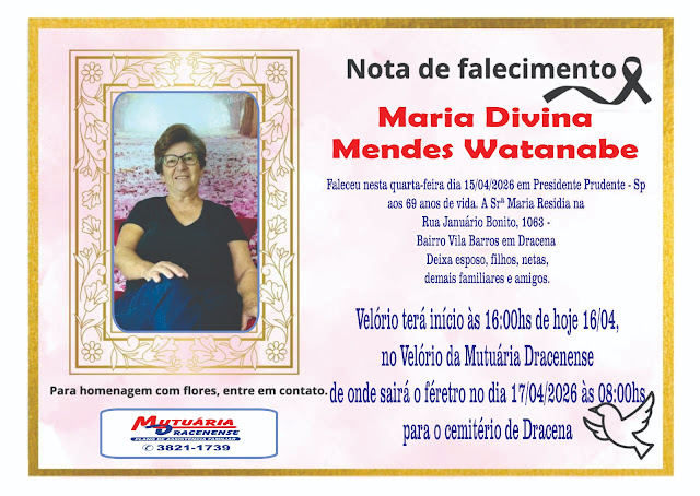 Faleceu Maria Divina Mendes Watanabe que residia em Dracena