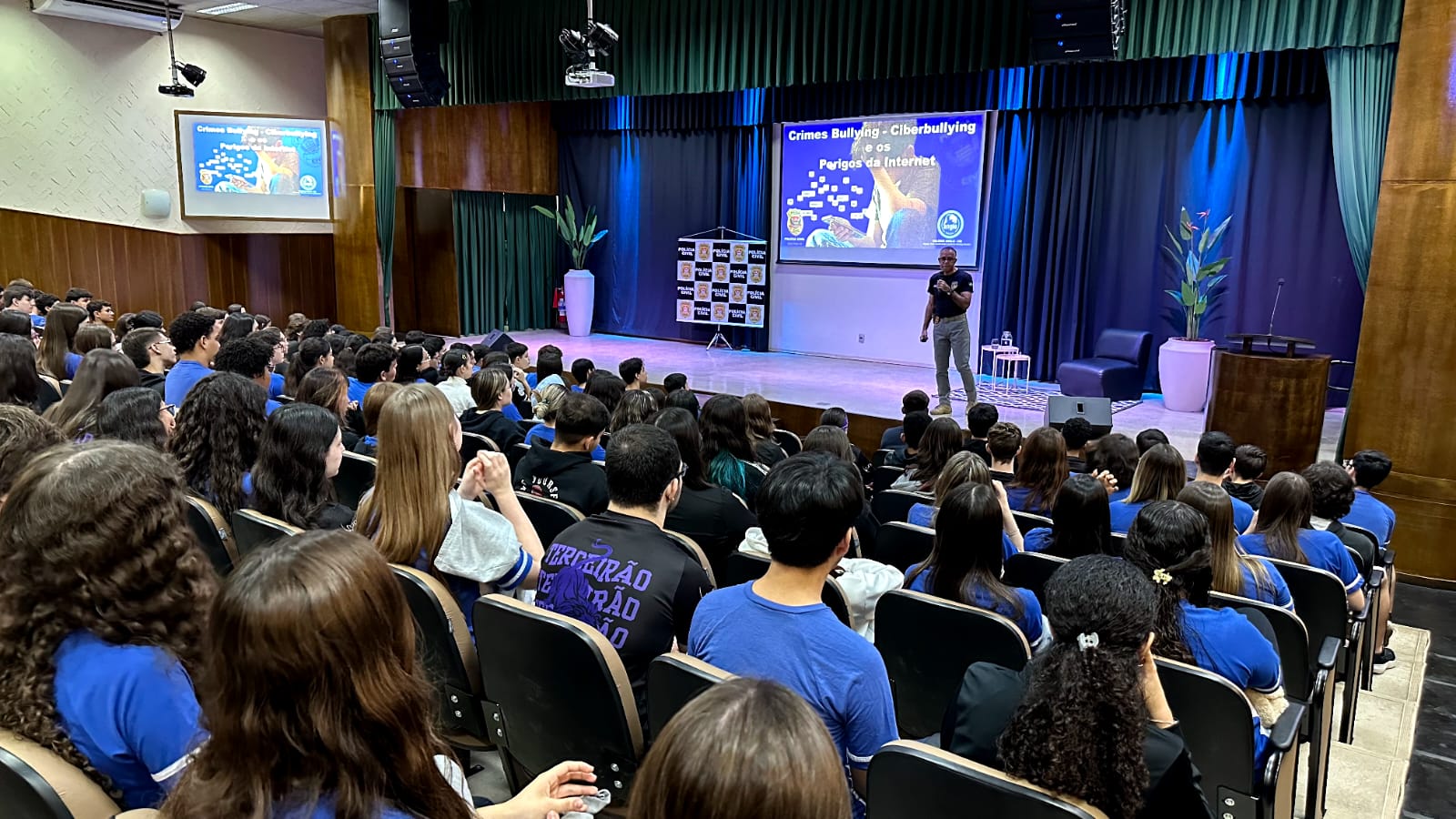 A atividade foi promovida a convite da equipe gestora da instituição de ensino e teve como objetivo orientar e conscientizar os estudantes acerca dos riscos e das consequências do bullying, do ciberbullying e do uso inadequado da internet e das redes sociais.