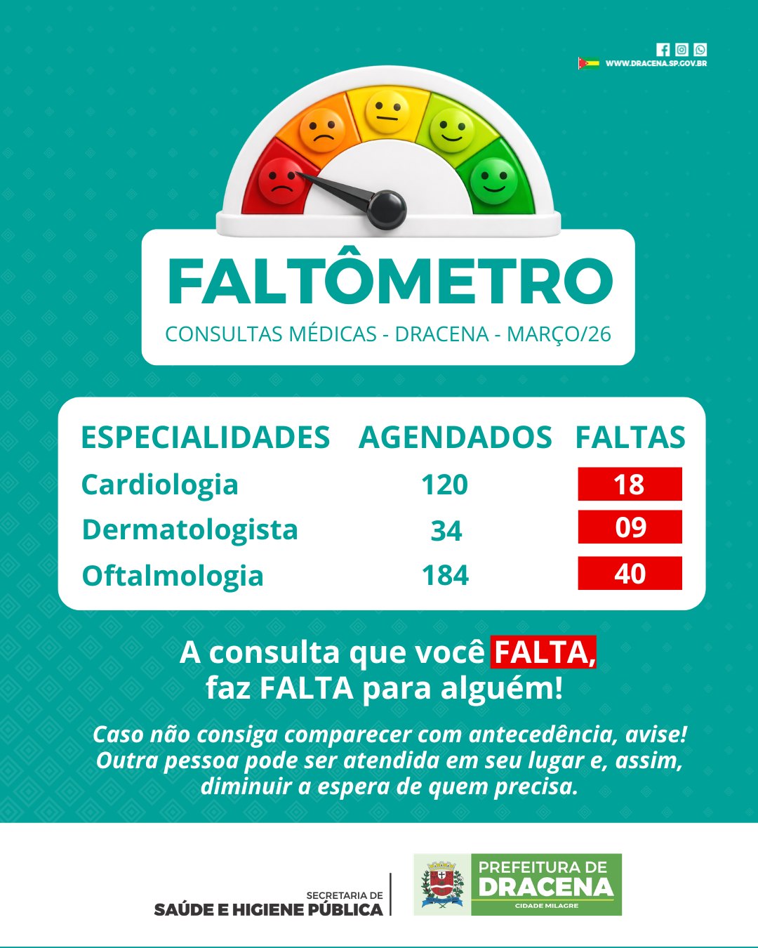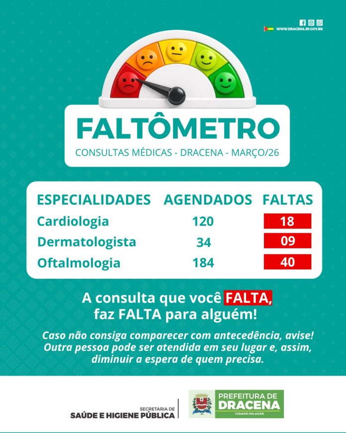 A Prefeitura de Dracena divulga o faltômetro da saúde referência do mês de março, destacando o número de pacientes que não compareceram às consultas médicas agendadas nas especialidades.